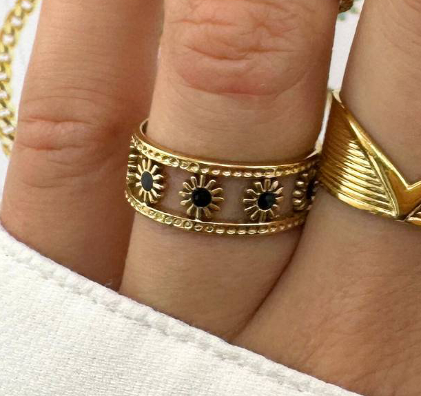 Ringen er skabt i tredobbelt 18k forgyldt rustfrit stål med avanceret titanium-belægning, der sikrer den rige guldglans holder sig i lang tid uden at miste glansen eller irre.